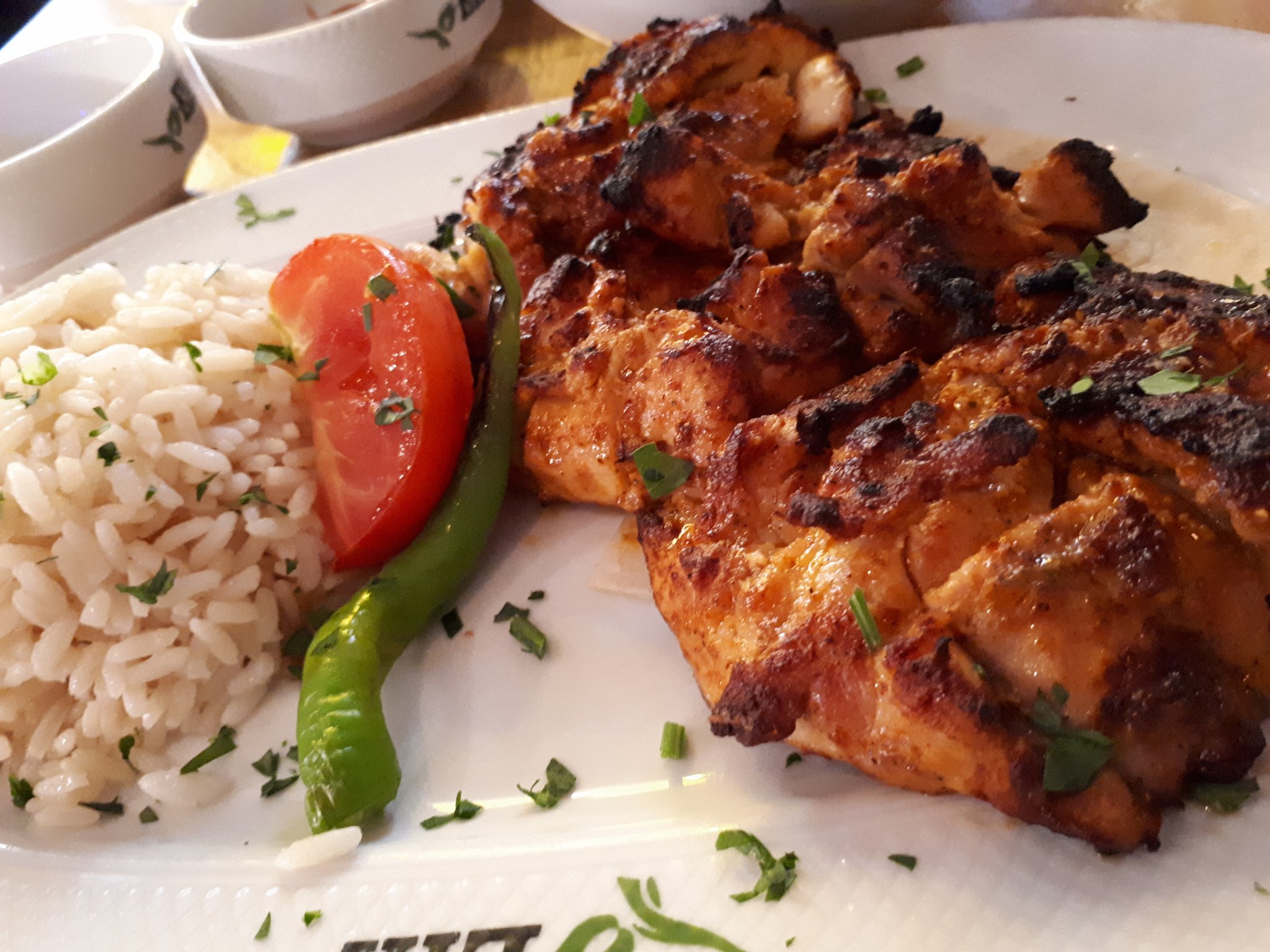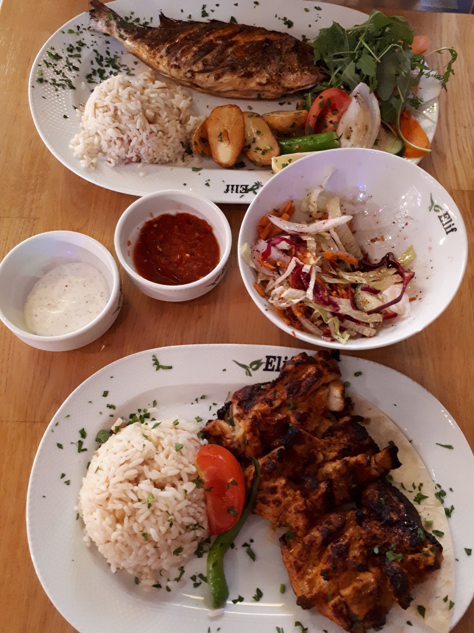 Bold Street has so many different types of cuisine, from all over the world, that it is hard to stand out and entice new customers inside. The exterior signage is yellow, so immediately stands out from the crowd, to us though this isn’t the best colour to associate with food. Don’t let that actually put you off though, it’s worth walking in and taking a look at the food on offer. The meat, fish, and vegetables being grilled is a sight (and smell) to behold, and makes for a salivating experience as you take your seat and peruse the menu. The tables are warm and inviting too, and a nice little touch is that all the crockery and glassware has the Elif name and logo branding on it.